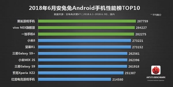 بنچمارک مشهور AnTuTu از نظر بهترین عملکرد تعداد ۱۰ دستگاه موبایل را نشان داده این ارقام مربوط به ماه ژوئن ۲۰۱۸ است و ما می توانیم ببینیم که در این ماه تعداد دیگری نیز به این لیست اضافه شده است. همان طور که انتظار می رفت، همه موبایل هایی که در این لیست آورده شده از تراشه Snapdragon 845 تغذیه می کنند. همه این مدل ها محدودیت های حرارتی متفاوتی داشته و با نسخه های مختلف اندروید اجرا می شوند اما امتیازی که در این سایت کسب کرده اند بسیار به هم نزدیک است.