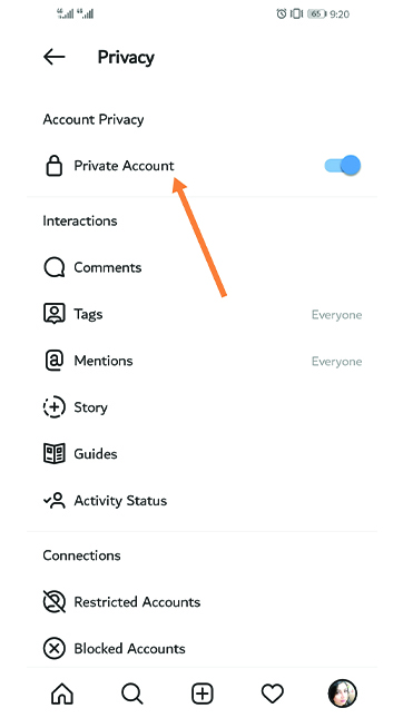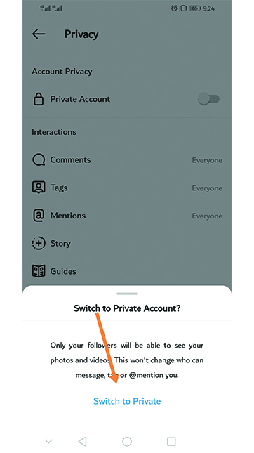 ۲. در منوی تنظیمات به قسمت privacy رفته و private account را فعال کنید، پیغامی برای شما نمایش داده میشود، برای تایید switch to private را بزنید. در این حالت اینستاگرام شما خصوصی شده و گزینه copy link در پستهایتان غیر فعال میشود.