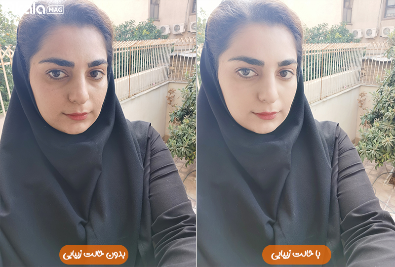 عکس سمت چپ بدون حالت زیبایی گرفته شده است، همانطور که مشاهده میکنید بافت صورت طبیعیست و عکس با چهره واقعی تفاوتی ندارد، در عکس دوم با اعمال تنظیمات زیبایی هم پوست صورت صاف شده و هم تنالیته پوست به دلخواه و سلیقه کاربر سفارشی شده است و عکس کمی با چهره واقعی تفاوت دارد.