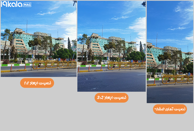 اولین چیزی که در قسمت تنظیمات میبینید «Aspect Ratio» است، با کمک این قسمت تصمیم میگیرید که عکس با چه نسبتی گرفته شود، برای درک بهتر ما سه عکس با ۳ Aspect Ratio متفاوت را کنار یکدیگر گذاشتهایم.