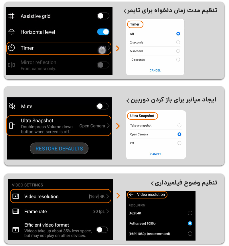 در این قسمت آپشنی به نام «Ultra snapshot» وجود دارد و به این صورت عمل میکند که اگر Take Snapshot فعال باشد، کافیست ۲ بار پشت سرهم دکمه پایینی کنترل صدا را بزنید تا گوشی عکس بگیرد و اگر Open camera را انتخاب کرده باشید، با ۲ بار فشار دادن دکمه پایین راکر کنترل صدا دوربین گوشی باز میشود.
