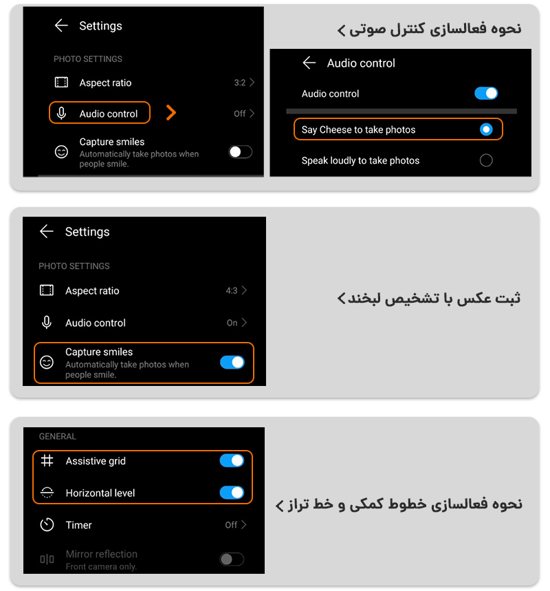 این قابلیت براساس صدا کار میکند و با فعال کردن این گزینه اگر موقع عکس گرفتن بگویید “چیییییییز” دوربین از شما عکس خواهد گرفت.