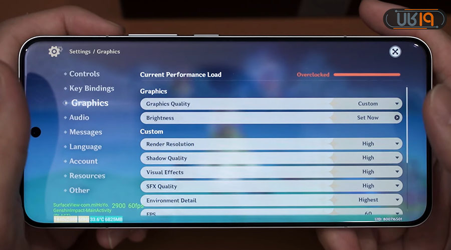 در بین بازیها، یکی از گرافیکیترین عناوین، گنشین ایمپکت است که برای تست قدرت پردازش، عموماً به سراغ آن میرویم. صادقانه بگوییم که این بازی در حالتی عالی پردازش میشود که در تصویر پایین میتوانید این تنظیمات را ببینید. در اینجا ترکیب نرمافزار و سختافزار، کیفیتی عالی را برای گیمرها فراهم میکند؛ چراکه، میتوان ویژگی Game Boost (قابلیت نرمافزاری) را از طریق پنل اعلان فعال کرد که کمک میکند گوشی بتواند از حداکثر پتانسیل این تراشه نهایت استفاده را ببرد.